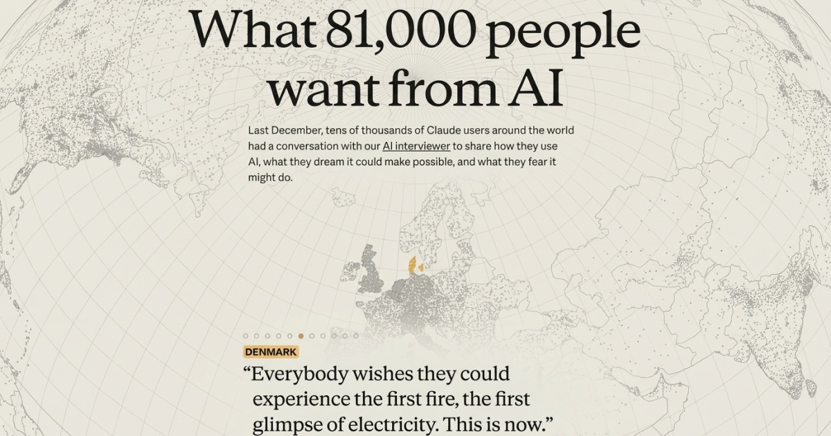 Anthropic, the company behind Claude, just published what it believes is the largest qualitative study ever conducted. Over one week in December, 80,508 Claude users across 159 countries and 70 languages sat down with an AI interviewer to share their hopes, fears, and real experiences with the technology.
