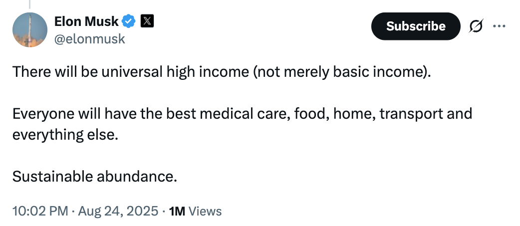 But Musk goes beyond traditional Universal Basic Income (UBI) proposals. His Universal High Income (UHI) echoes David Patterson's concept of Universal Equal Income (UEI).