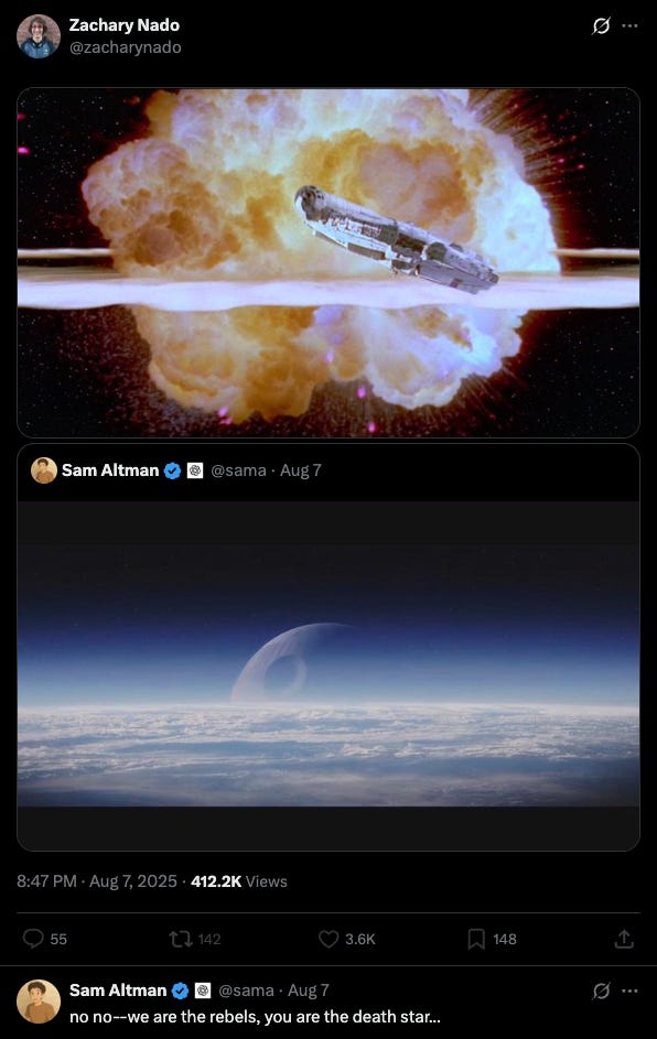 This was Sam Altman's response to a Google employee’s Star Wars meme that positioned Google as the scrappy rebels fighting the OpenAI Death Star.
